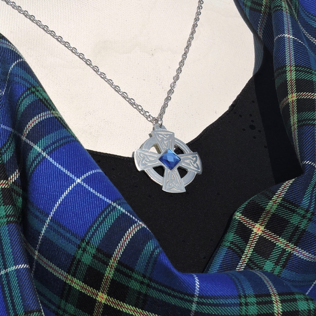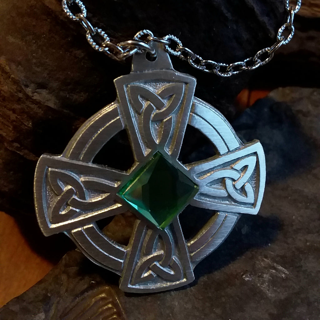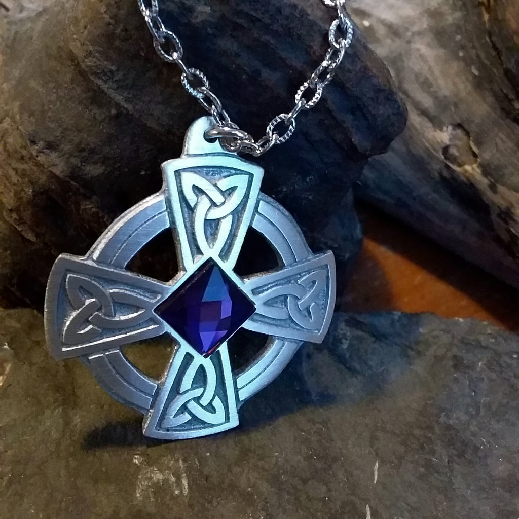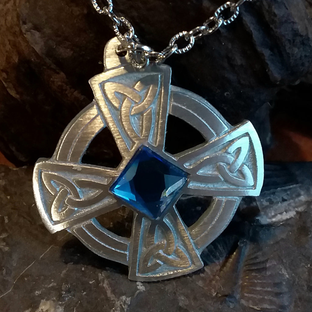 Crafted from fine pewter, this simple four armed Celtic Cross with trinity knots makes a lovely kilt pin. The centre is accented with a 10mm square glass gem.